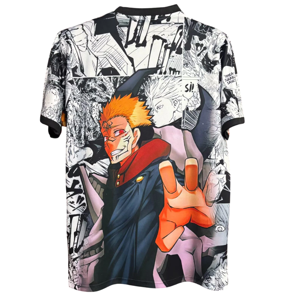 A camisa combina tons monocromáticos inspirados nos traços do mangá com cores vibrantes para realçar Sukuna em toda a sua imponência. O fundo detalhado com cenas marcantes do anime adiciona ainda mais profundidade e estilo à peça, tornando-a uma verdadeira obra de arte para fãs da série e colecionadores.